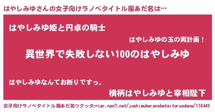 | 胡散臭い通販商品みたいなあだ名 | 『絶対に幸福をもたらす水素水…その名も「はやしみゆ」』 |