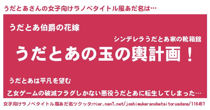 | 男性向けラノベタイトル風あだ名 | 『うだとあ~年齢イコール彼女いない歴の魔法使い~』 |