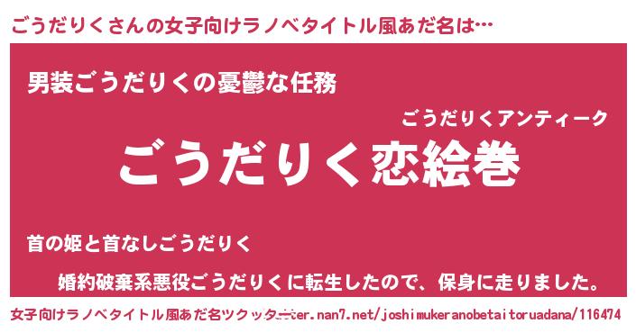 | 男性向けラノベタイトル風あだ名 | 『おまえをオタクにしてやるから、俺をごうだりくにしてくれ! 』 |