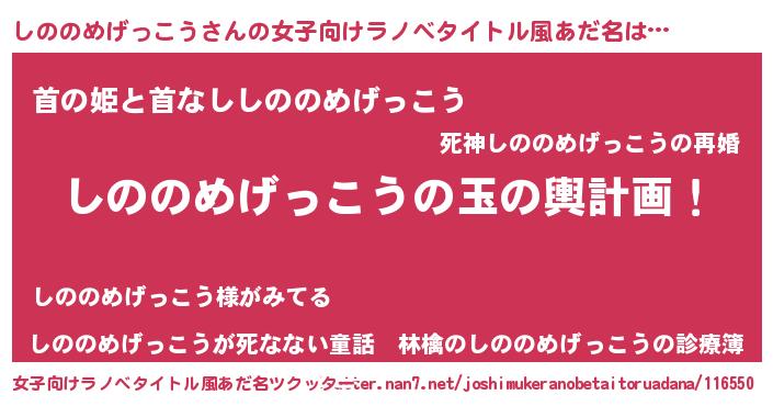 | 男性向けラノベタイトル風あだ名 | 『転生したらしののめげっこうだった件』 |