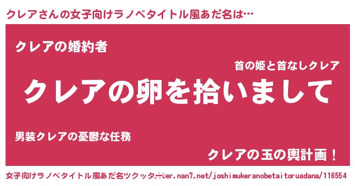 | 男性向けラノベタイトル風あだ名 | 『クレアの嫁は女の子じゃないと思った?』 |