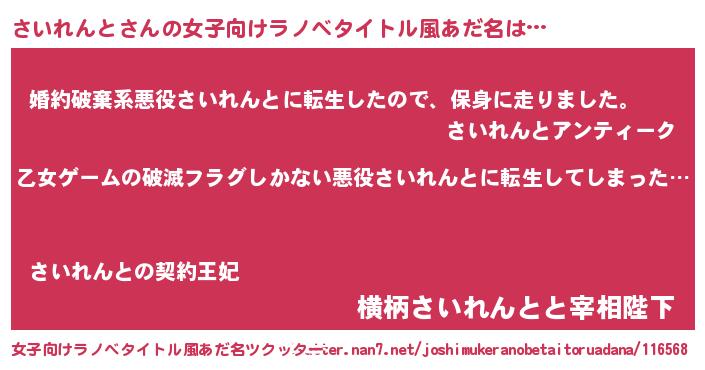| 男性向けラノベタイトル風あだ名 | 『この素晴らしい世界にさいれんとを!』 |