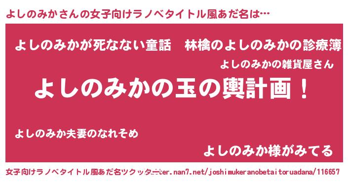 | 男性向けラノベタイトル風あだ名 | 『よしのみか~年齢イコール彼女いない歴の魔法使い~』 |