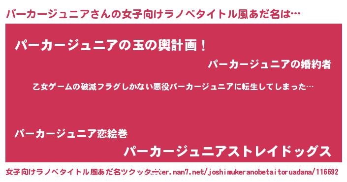 | 男性向けラノベタイトル風あだ名 | 『この素晴らしい世界にパーカージュニアを!』 |