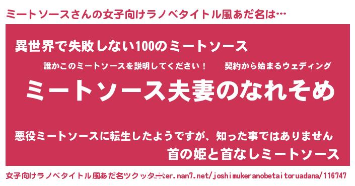 | 男性向けラノベタイトル風あだ名 | 『おまえをオタクにしてやるから、俺をミートソースにしてくれ! 』 |