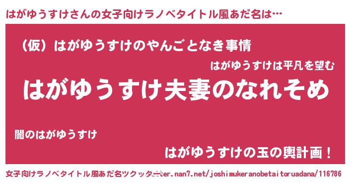 | 男性向けラノベタイトル風あだ名 | 『おまえをオタクにしてやるから、俺をはがゆうすけにしてくれ! 』 |