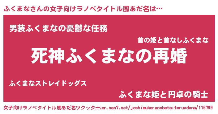 ふくまなさんの女子向けラノベタイトル風あだ名は… 『死神ふくまなの再婚』『男装ふくまなの憂鬱な任務』『ふくまな姫と円卓の騎士』 ツクッター #女子向けラノベタイトル風あだ名ツクッター http://tkutter.nan7.net/joshimukeranobetaitoruadana/116799/