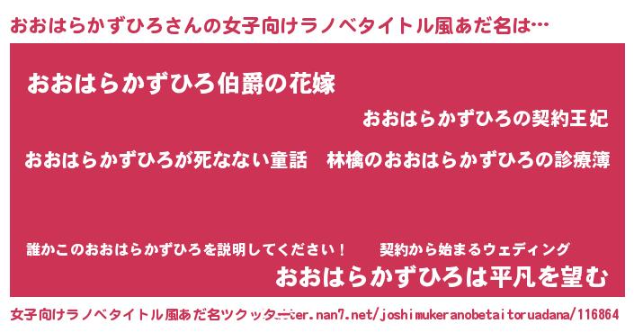 おおはらかずひろさんの女子向けラノベタイトル風あだ名は… 『おおはらかずひろが死なない童話 林檎のおおはらかずひろの診療簿』『おおはらかずひろ伯爵の花嫁』『おおはらかずひろは平凡を望む』 ツクッター #女子向けラノベタイトル風あだ名ツクッター http://tkutter.nan7.net/joshimukeranobetaitoruadana/116864/