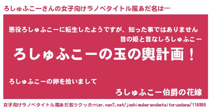 ろしゅふこーさんの女子向けラノベタイトル風あだ名は… 『ろしゅふこーの玉の輿計画!』『悪役ろしゅふこーに転生したようですが、知った事ではありません』『ろしゅふこー伯爵の花嫁』 ツクッター #女子向けラノベタイトル風あだ名ツクッター http://tkutter.nan7.net/joshimukeranobetaitoruadana/116880/