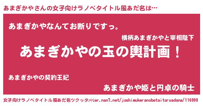 | 男性向けラノベタイトル風あだ名 | 『あまぎかや~年齢イコール彼女いない歴の魔法使い~』 |