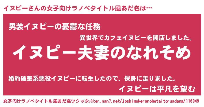 | 男性向けラノベタイトル風あだ名 | 『おまえをオタクにしてやるから、俺をイヌピーにしてくれ! 』 |