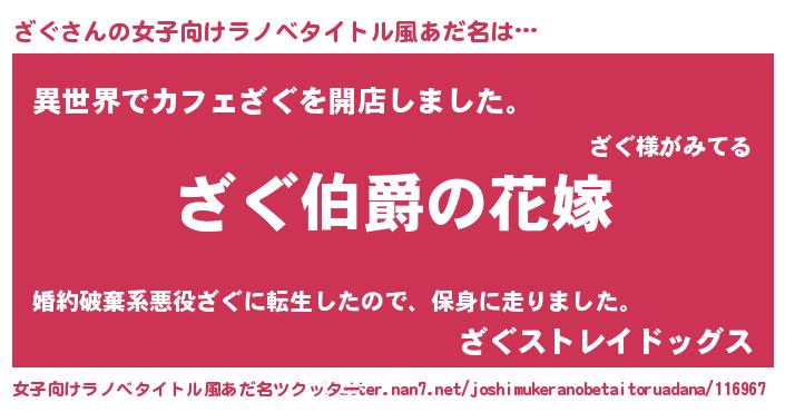| 男性向けラノベタイトル風あだ名 | 『うちの娘の為ならば、俺はもしかしたらざぐも倒せるかもしれない。』 |
