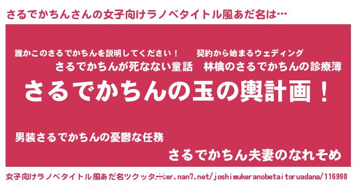 | 男性向けラノベタイトル風あだ名 | 『さるでかちん~年齢イコール彼女いない歴の魔法使い~』 |
