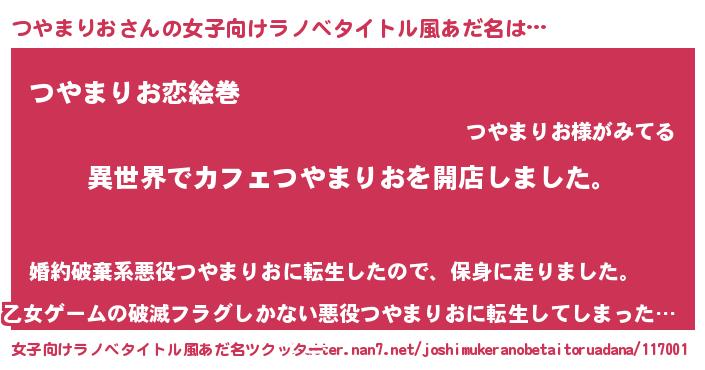 | 男性向けラノベタイトル風あだ名 | 『誰もが恐れるあのつやまりおが、ぼくの専属メイドになるようです。』 |