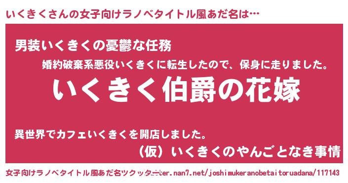 | 男性向けラノベタイトル風あだ名 | 『うちの娘の為ならば、俺はもしかしたらいくきくも倒せるかもしれない。』 |