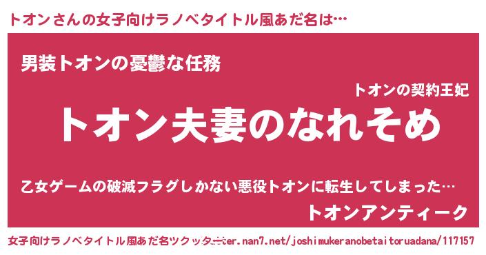 | 男性向けラノベタイトル風あだ名 | 『おまえをオタクにしてやるから、俺をトオンにしてくれ! 』 |