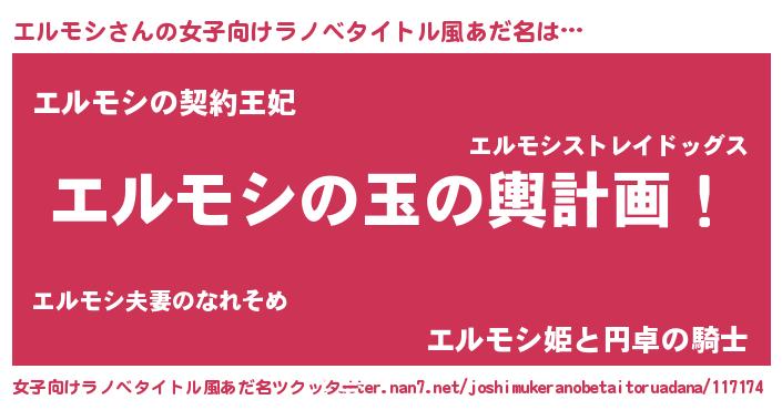 | 男性向けラノベタイトル風あだ名 | 『エルモシ~年齢イコール彼女いない歴の魔法使い~』 |