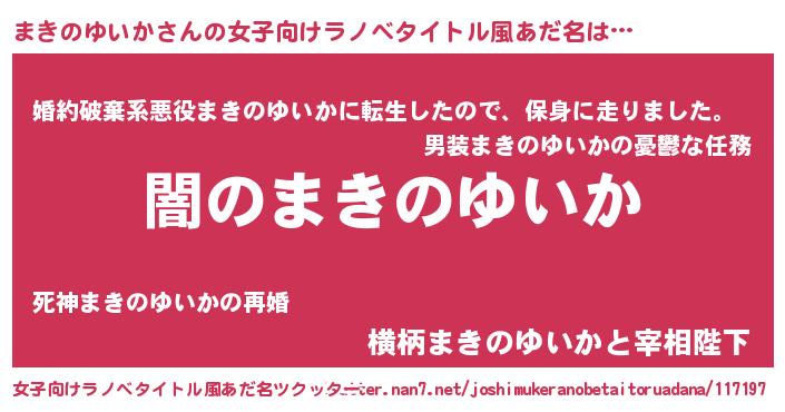 まきのゆいかさんの女子向けラノベタイトル風あだ名は… 『闇のまきのゆいか』『婚約破棄系悪役まきのゆいかに転生したので、保身に走りました。』『横柄まきのゆいかと宰相陛下』 ツクッター #女子向けラノベタイトル風あだ名ツクッター http://tkutter.nan7.net/joshimukeranobetaitoruadana/117197/