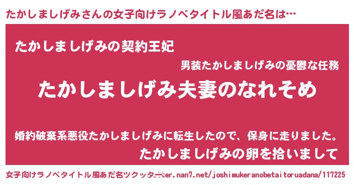 | 男性向けラノベタイトル風あだ名 | 『おまえをオタクにしてやるから、俺をたかしましげみにしてくれ! 』 |