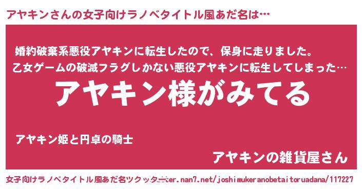 | 男性向けラノベタイトル風あだ名 | 『アヤキンの嫁は女の子じゃないと思った?』 |