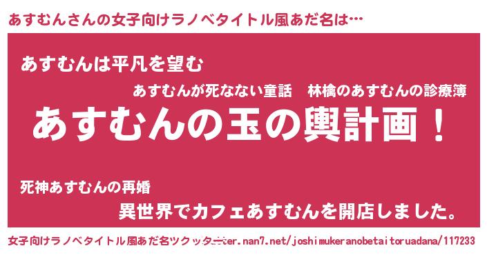 | 男性向けラノベタイトル風あだ名 | 『あすむん~年齢イコール彼女いない歴の魔法使い~』 |