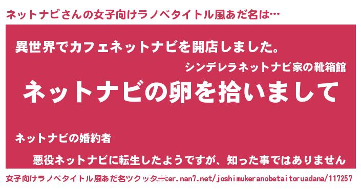 | 男性向けラノベタイトル風あだ名 | 『ネットナビの嫁は女の子じゃないと思った?』 |