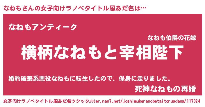 | 男性向けラノベタイトル風あだ名 | 『なねもに滅ぼされるだけの簡単なお仕事です』 |