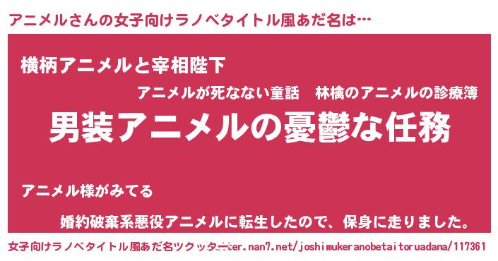| 男性向けラノベタイトル風あだ名 | 『うちのアニメルが世界を掌握している!』 |