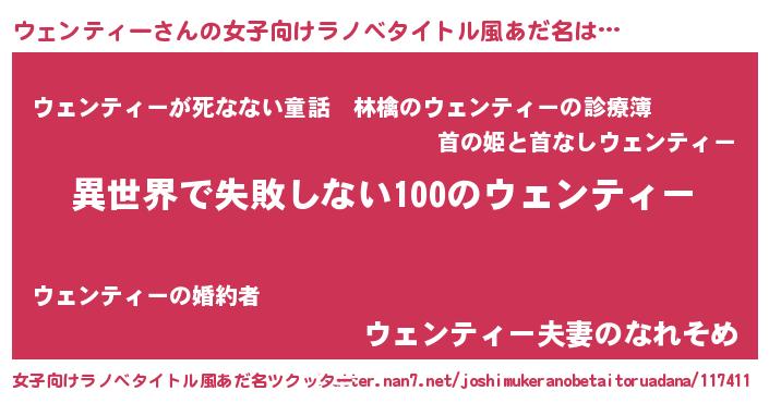 | 男性向けラノベタイトル風あだ名 | 『ウェンティーという概念が存在しない退屈な世界 』 |