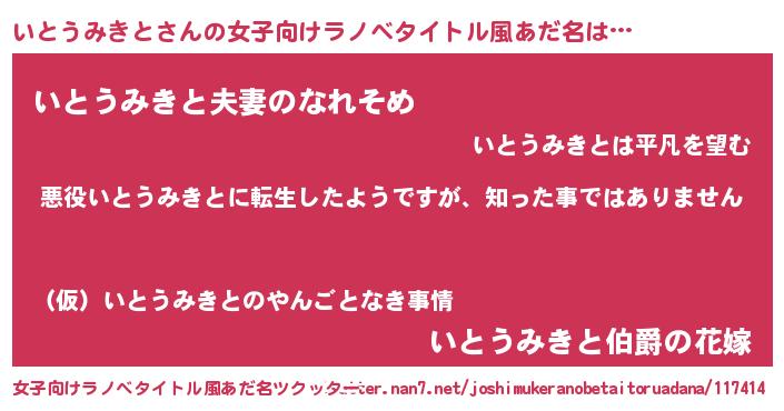 | 男性向けラノベタイトル風あだ名 | 『この素晴らしい世界にいとうみきとを!』 |
