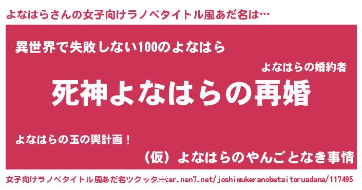 | 男性向けラノベタイトル風あだ名 | 『ノーゲーム・ノーヨナハラ』 |