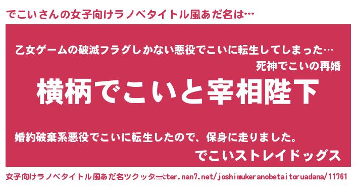 | 男性向けラノベタイトル風あだ名 | 『でこいに滅ぼされるだけの簡単なお仕事です』 |