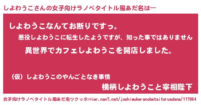 | 男性向けラノベタイトル風あだ名 | 『誰もが恐れるあのしよわうこが、ぼくの専属メイドになるようです。』 |