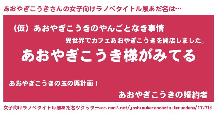 | 男性向けラノベタイトル風あだ名 | 『あおやぎこうきの嫁は女の子じゃないと思った?』 |