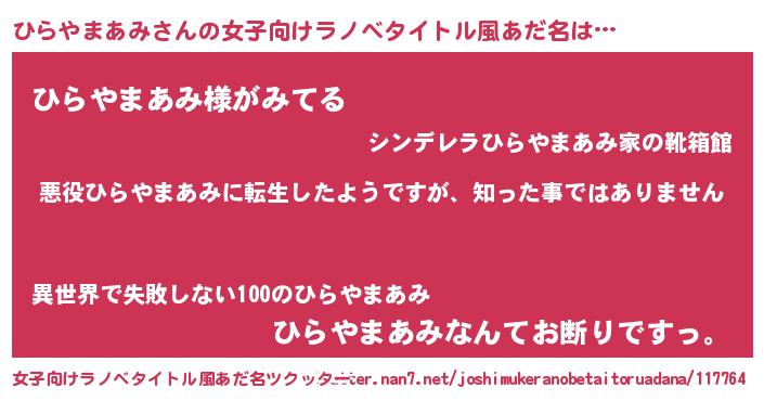 | 男性向けラノベタイトル風あだ名 | 『この素晴らしい世界にひらやまあみを!』 |