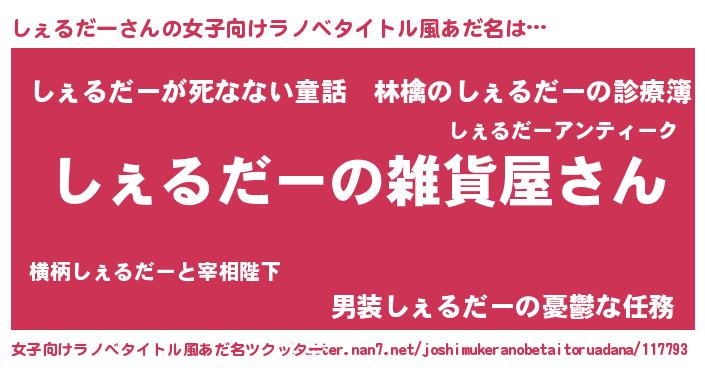 | 男性向けラノベタイトル風あだ名 | 『やはりしぇるだーの青春ラブコメはまちがっている 』 |