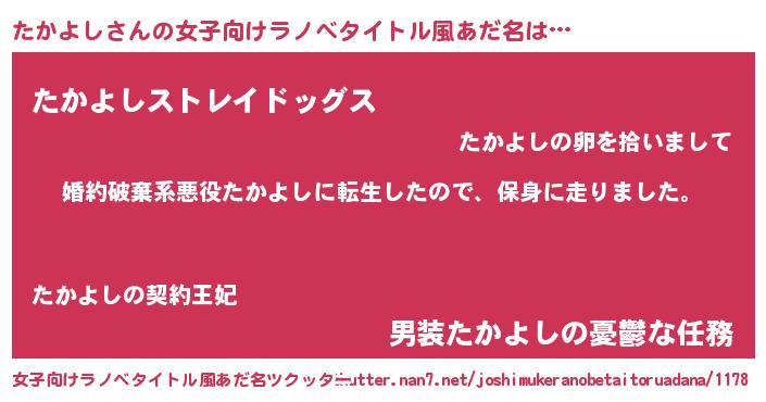 | 男性向けラノベタイトル風あだ名 | 『タカヨシスレイヤー』 |