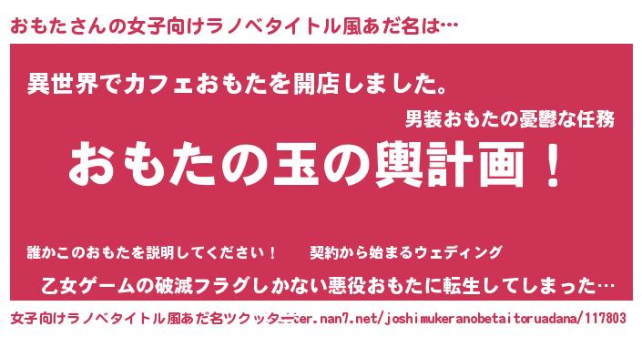 | 男性向けラノベタイトル風あだ名 | 『おもた~年齢イコール彼女いない歴の魔法使い~』 |