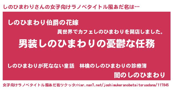 | 男性向けラノベタイトル風あだ名 | 『うちのしのひまわりが世界を掌握している!』 |