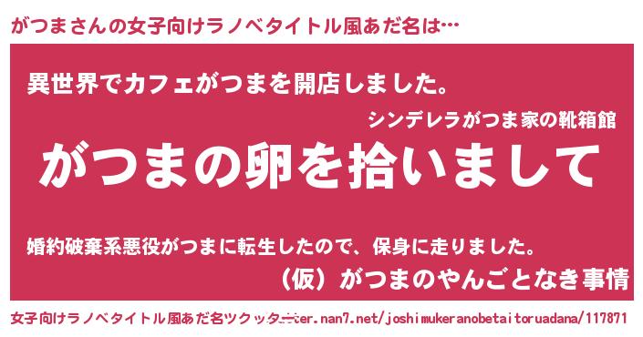 | 男性向けラノベタイトル風あだ名 | 『がつまの嫁は女の子じゃないと思った?』 |