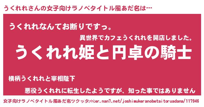 | 男性向けラノベタイトル風あだ名 | 『うくれれの憂鬱』 |