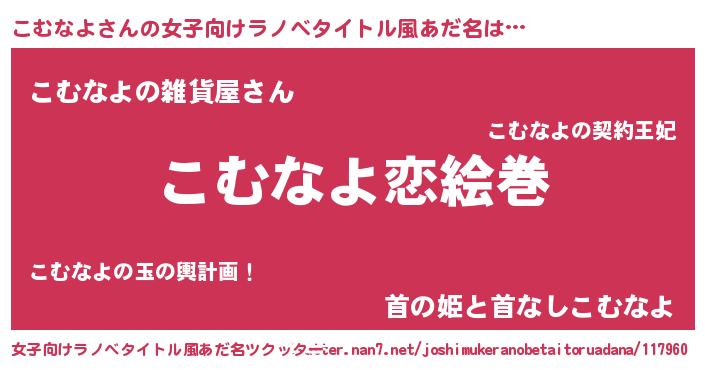 こむなよさんの女子向けラノベタイトル風あだ名は… 『こむなよ恋絵巻』『こむなよの雑貨屋さん』『首の姫と首なしこむなよ』 ツクッター #女子向けラノベタイトル風あだ名ツクッター http://tkutter.nan7.net/joshimukeranobetaitoruadana/117960/