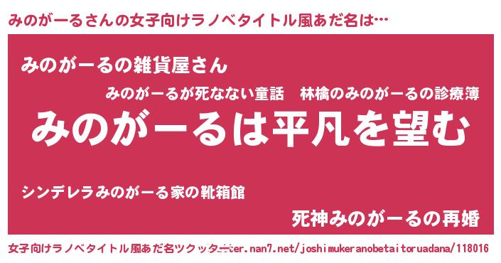 | 男性向けラノベタイトル風あだ名 | 『ダンジョンにみのがーるを求めるのは間違っているだろうか』 |