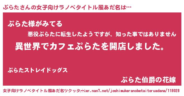 | 男性向けラノベタイトル風あだ名 | 『誰もが恐れるあのぷらたが、ぼくの専属メイドになるようです。』 |
