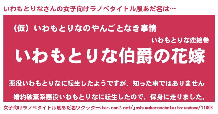 | 男性向けラノベタイトル風あだ名 | 『やはりいわもとりなの青春ラブコメはまちがっている 』 |