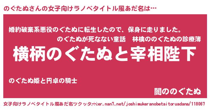 | 男性向けラノベタイトル風あだ名 | 『のぐたぬに滅ぼされるだけの簡単なお仕事です』 |