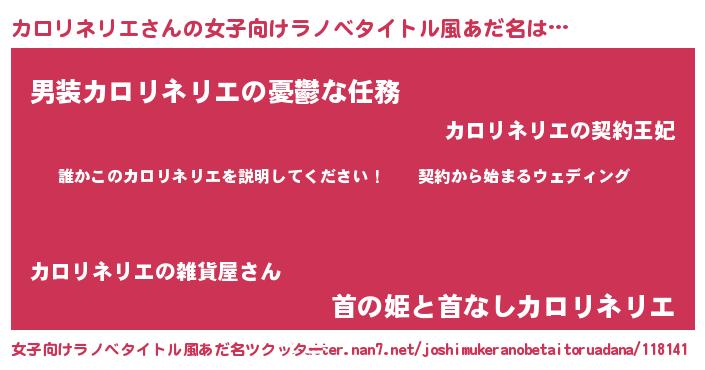 | 男性向けラノベタイトル風あだ名 | 『カロリネリエアートオンライン』 |