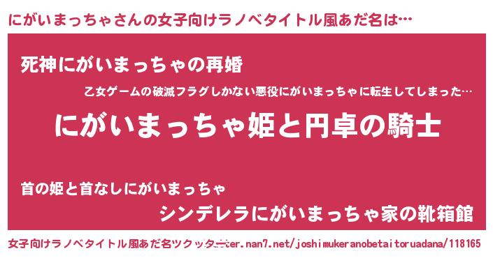| 男性向けラノベタイトル風あだ名 | 『にがいまっちゃの憂鬱』 |