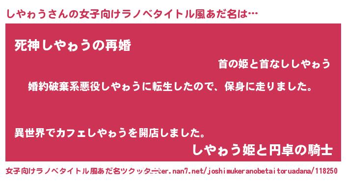 | 男性向けラノベタイトル風あだ名 | 『転生したらしやゎうだった件』 |