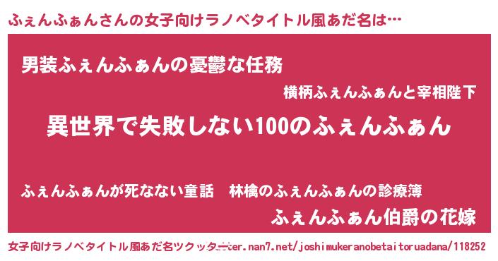 | 男性向けラノベタイトル風あだ名 | 『ふぇんふぁんという概念が存在しない退屈な世界 』 |